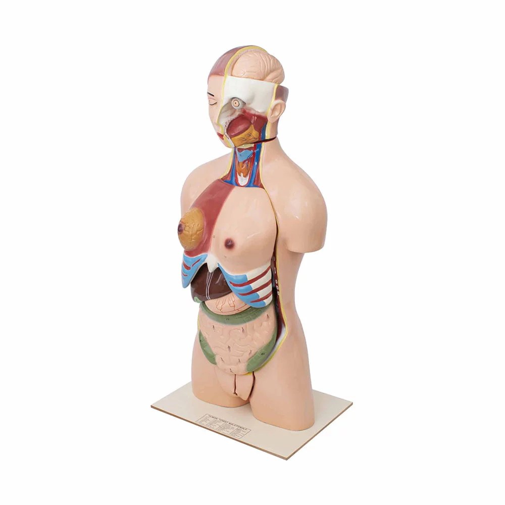 The right human lung is depicted in this comprehensive anatomical model in a dissectable manner, separated into two distinct portions to reveal key internal processes. The model facilitates the study of the lung’s anatomy by offering a thorough perspective of significant details within the lung. The model, which is mounted on a base, comes with a key card that helps identify and comprehend the many features and components. This model is a useful instructional tool for examining the minute details of the structure and operation of the human lung.